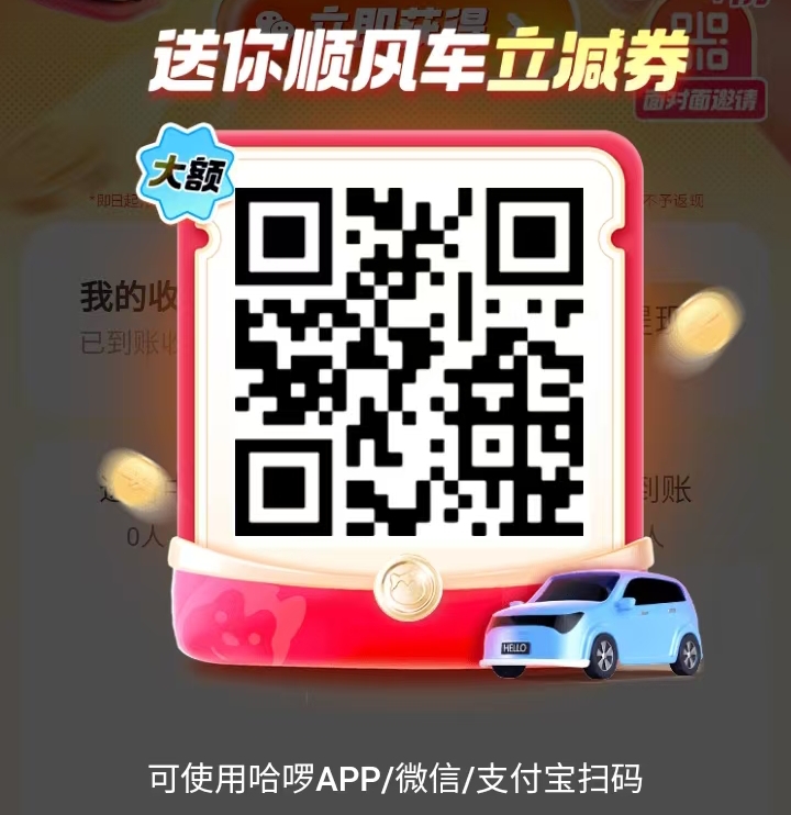 注意:领取哈啰顺风车优惠券,一定要从下面的官方二维码领取。不要从其它渠道的二维码或链接领取,防止被骗。